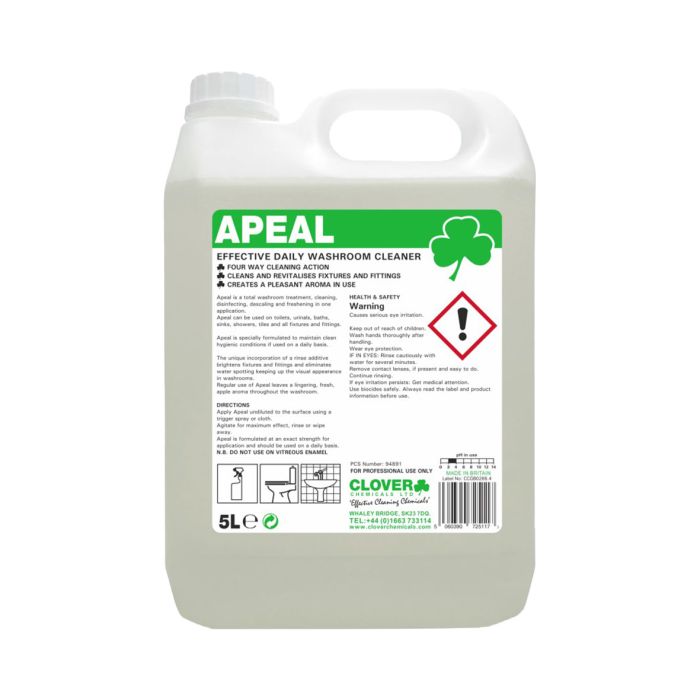 Apeal Washroom Cleaner 5Lt is a powerful, ready-to-use solution designed for effective washroom hygiene. Delivering a 4-in-1 cleaning action, it cleans, descales, deodorises and disinfects in a single application, helping maintain fresh and hygienic facilities.