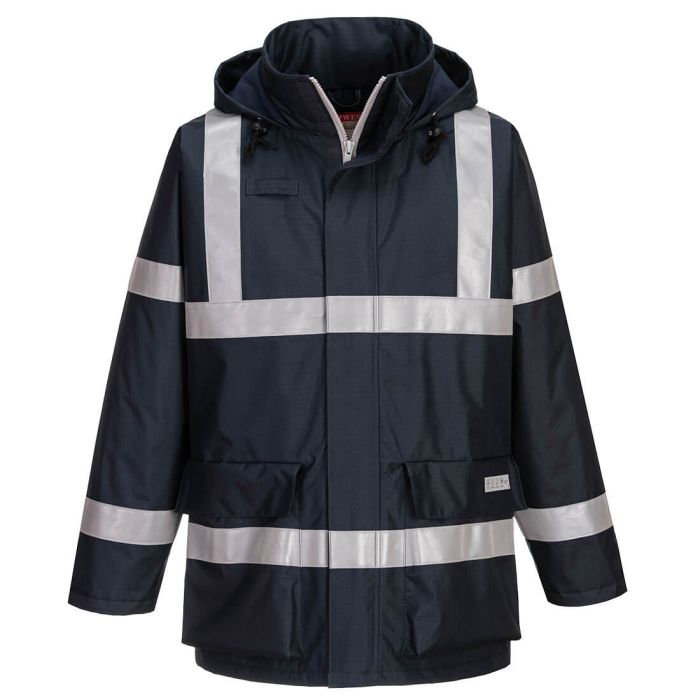 The Bizflame Rain FR Winter Jacket is a professional workwear garment designed for demanding environments. Flame resistant treated waterproof fabric prevents water penetration, Internal chest pocket, Storm flap front to protect against the elements, External standards label for quick identification of protection levels.